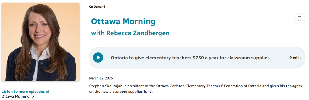 OCETFO President Stephen Skoutajan was interviewed by CBC Radio Canada about how the $750 supplies card for homeroom teachers is merely political theatre.